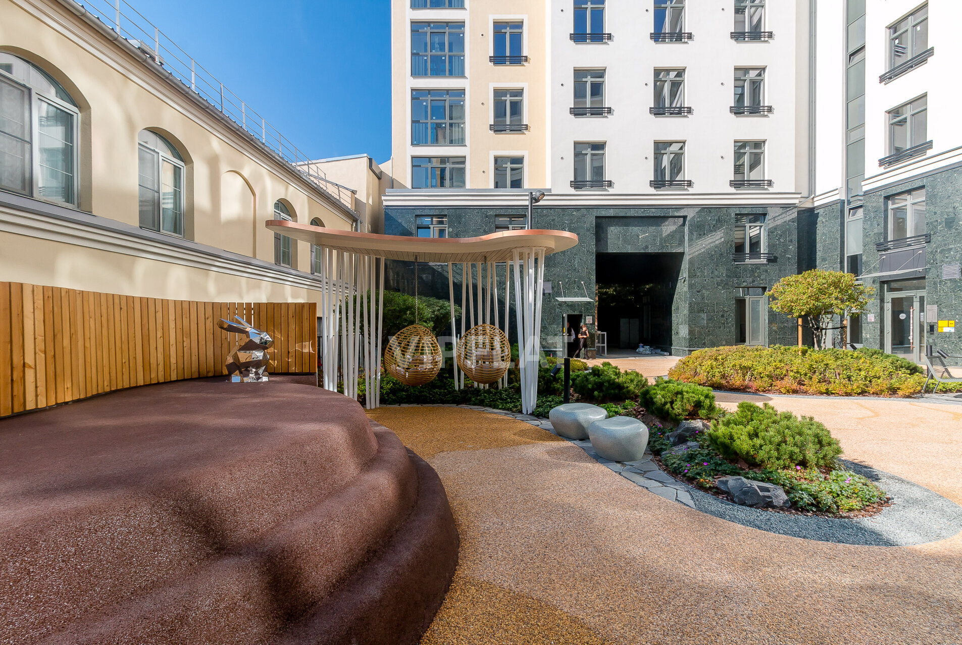 Отделка холлов продумана с точки зрения как эстетики, так и удобства. Сдержанность классики в цветовых решениях, элегантные предметы интерьера, функциональность и зонирование пространства создают атмосферу спокойствия и уверенности. Острова зелени с водной чашей в центре создают ощущение гармонии и умиротворения. Современная уличная мебель и освещение формируют домашнюю атмосферу уюта и представляют двор как дополнительное частное пространство для жизни.