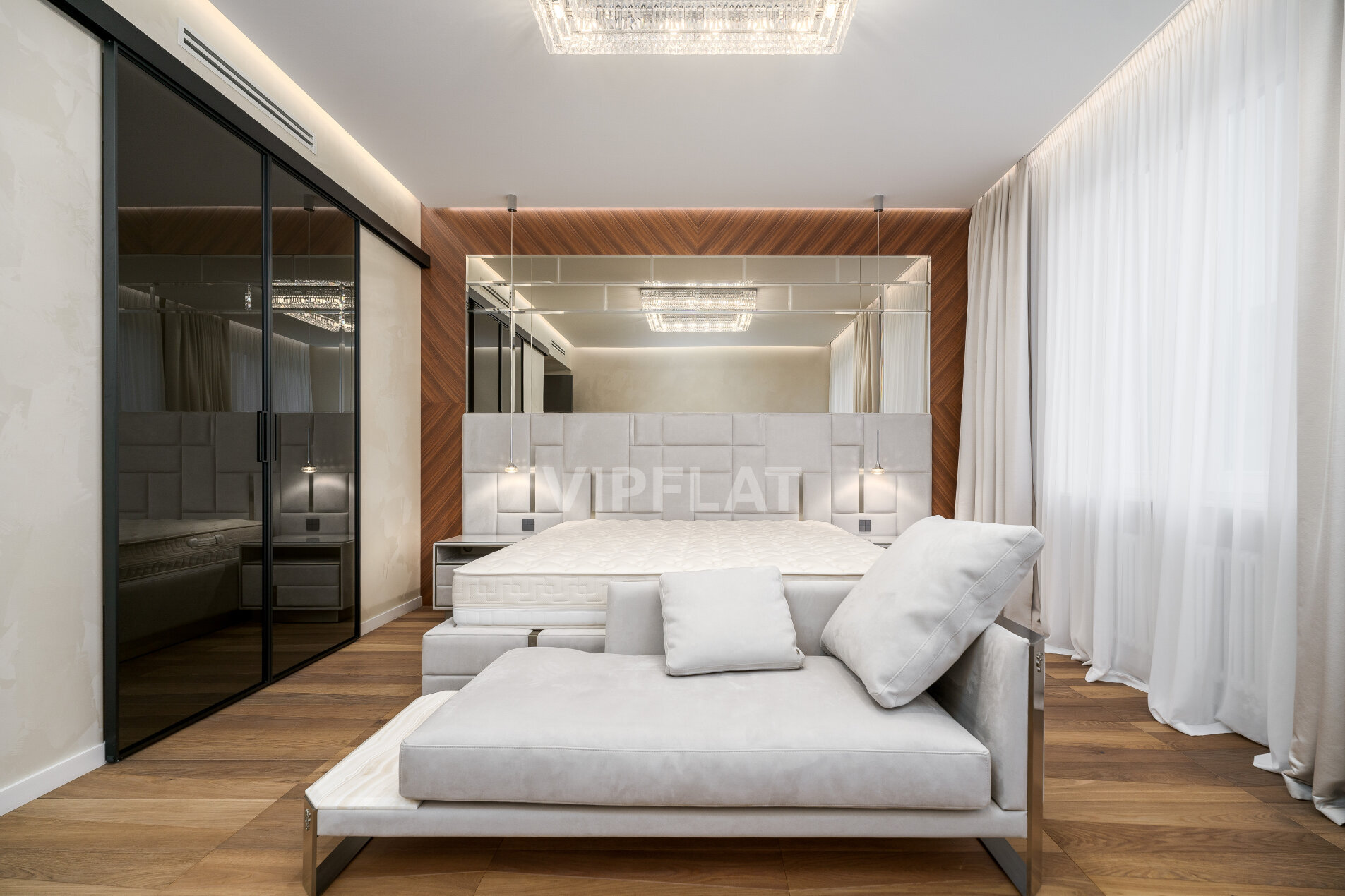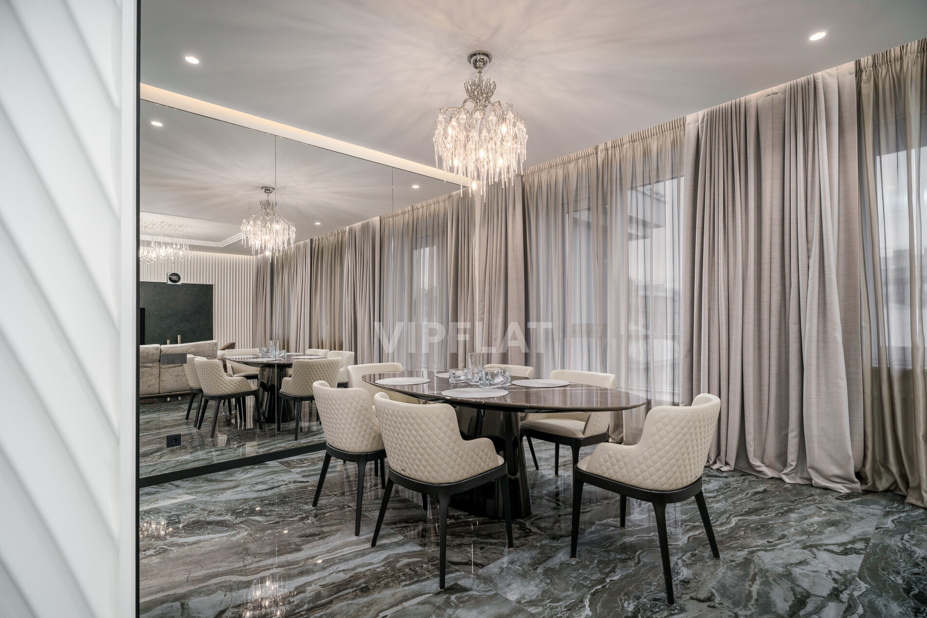 Планировка включает три спальни, два санузла и большую гардеробную. Квартира двухсторонняя, с семью окнами, из которых открываются виды на реконструируемый особняк Игеля и в противоположную сторону от проспекта.
