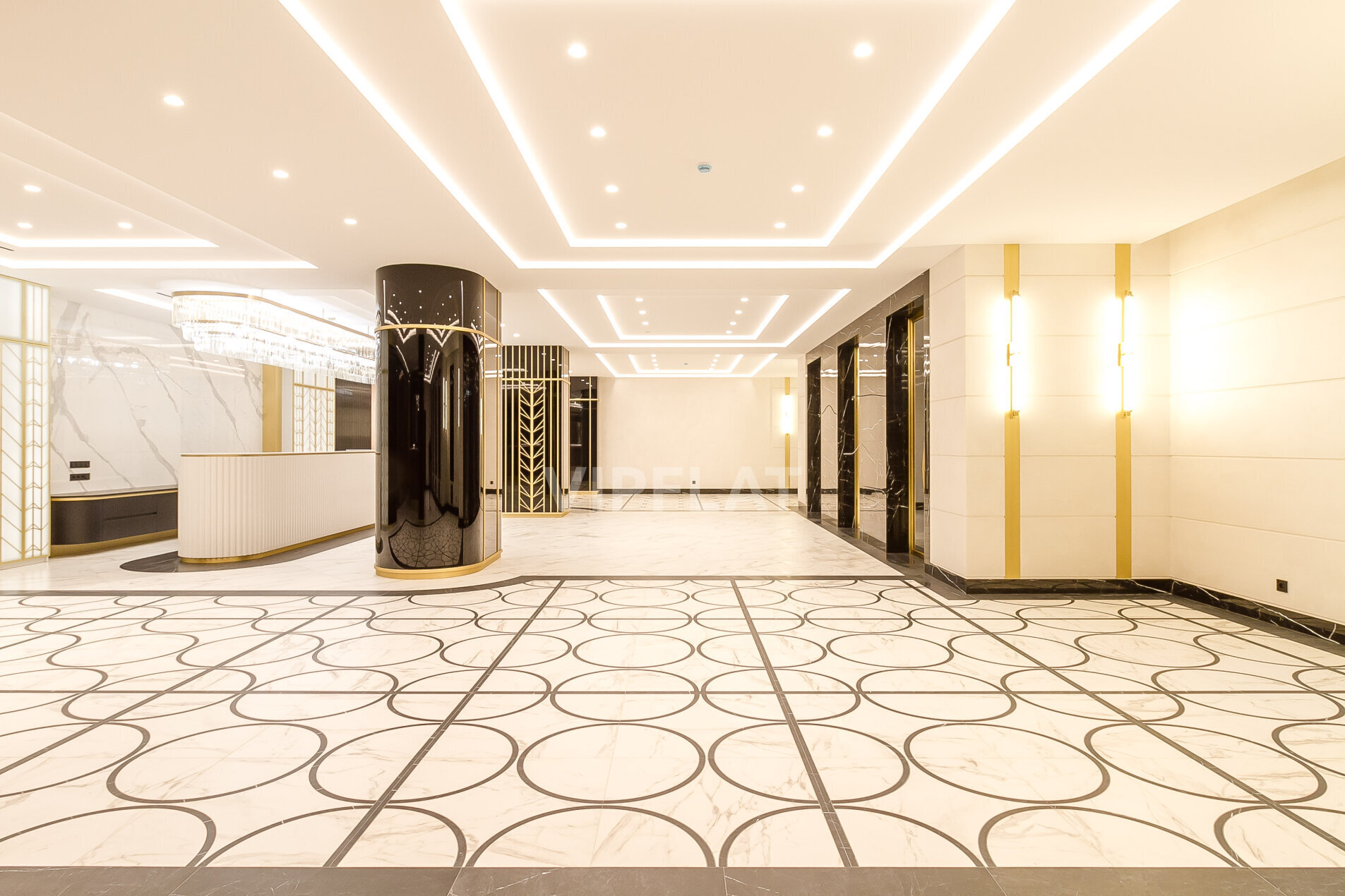 Гостей и жильцов дома встречают скульптуры сидящих львов при входе и роскошная зона лобби 400 метров, созданная с применением итальянского мрамора и ценных пород дерева. На первом этаже расположено уникальное пространство лобби-бара, которое позволит деловым людям, ценящим свое время, проводить встречи и переговоры за чашечкой кофе или бокалом вина, не выезжая из дома.