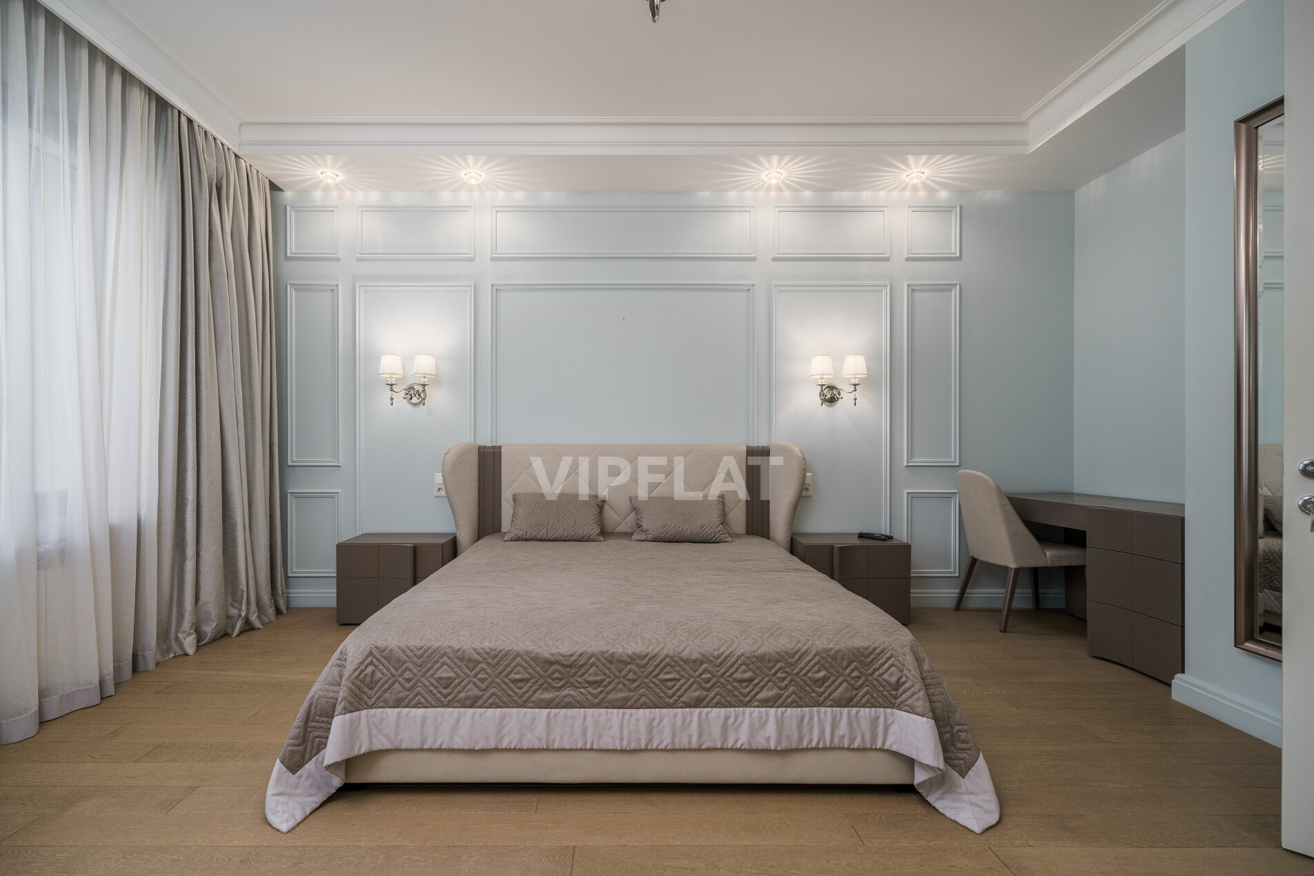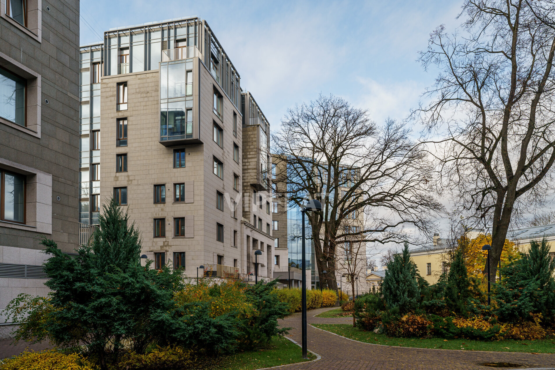 Квартира с продуманной планировкой: две изолированные спальни 22 и 19 м², кухня-гостиная 53 м² со столовой зоной и встроенной техникой Siemens и Liebherr, просторная прихожая 22 м², два раздельных санузла 10 и 4 м². Высота потолков — 3 м. Большие окна наполняют комнаты светом и раскрывают виды на зелёный благоустроенный парк. Детская — с окном «в пол» и прямым видом на парк. Вход в парадную — со стороны тихого двора, что подчёркивает приватность.