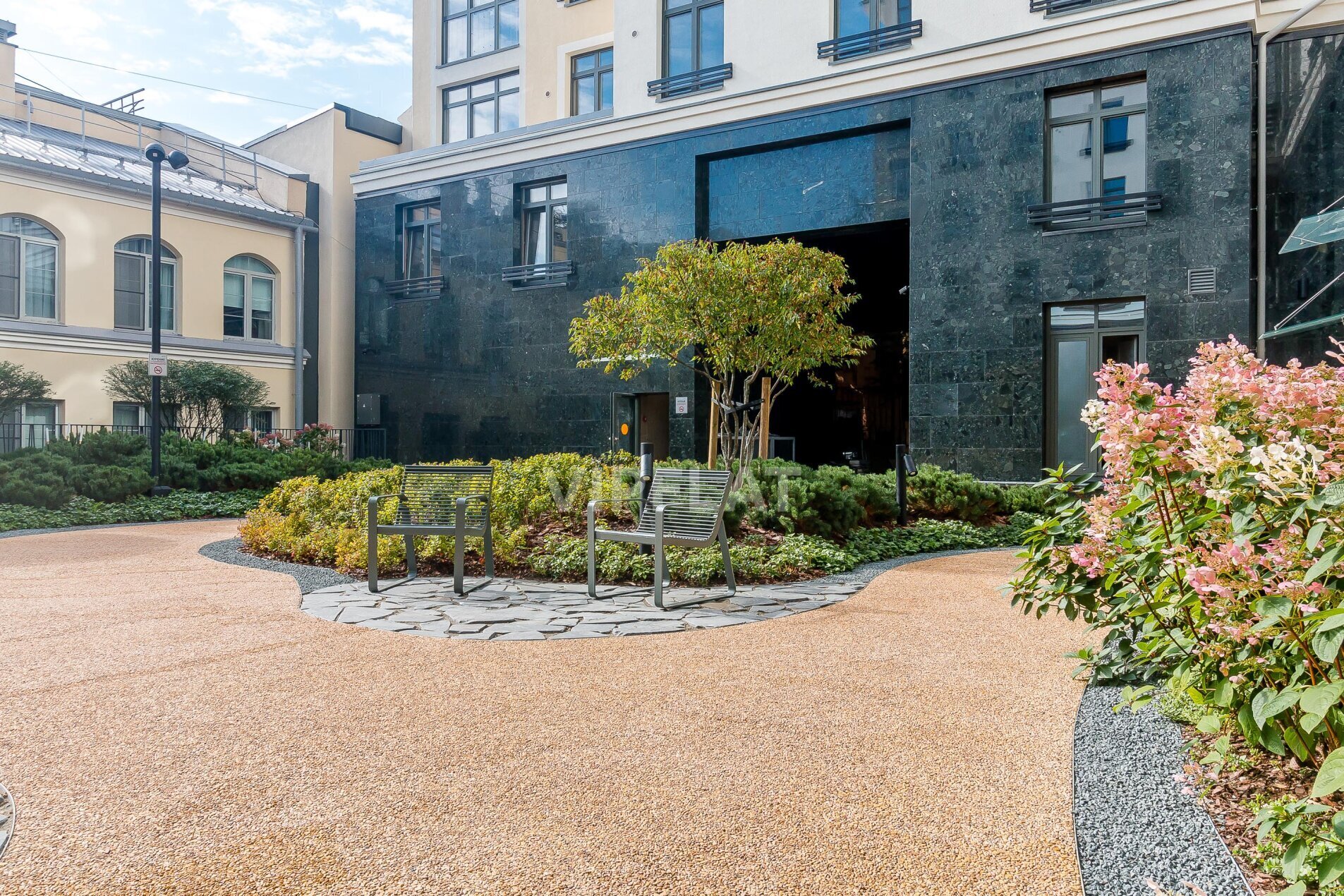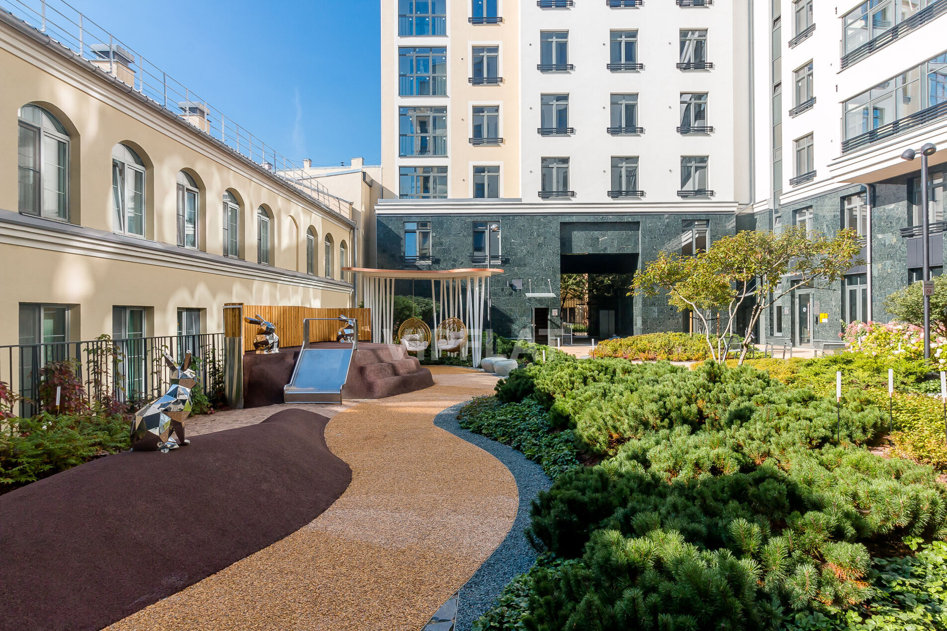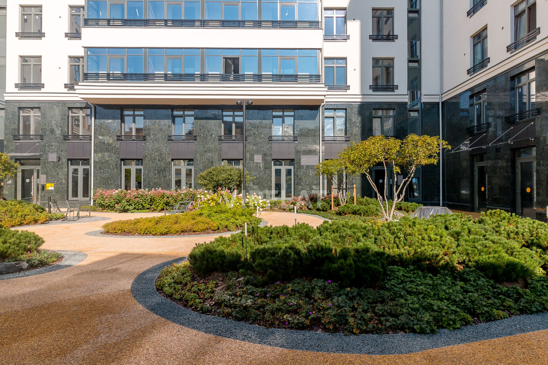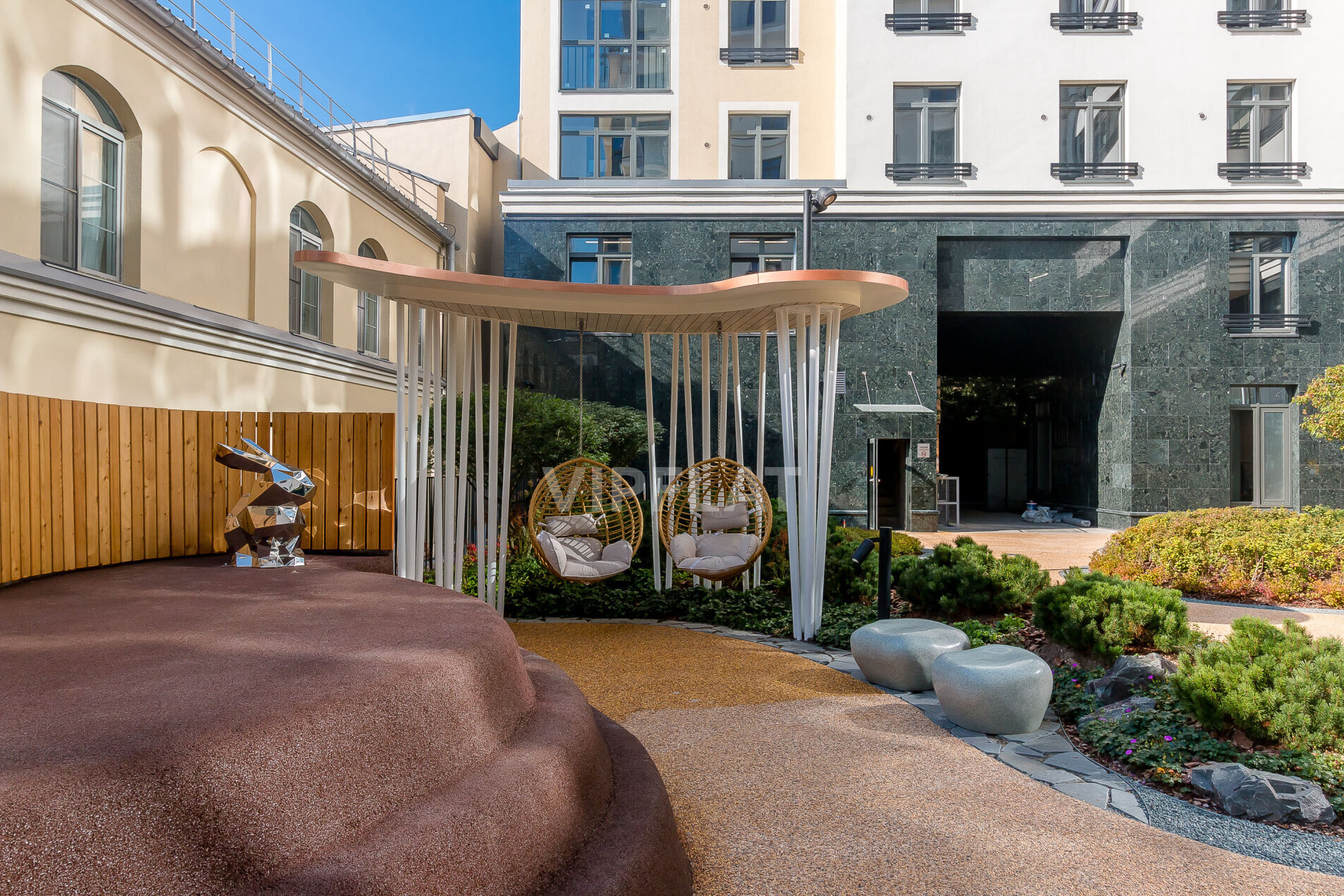 Отделка холлов продумана с точки зрения как эстетики, так и удобства. Сдержанность классики в цветовых решениях, элегантные предметы интерьера, функциональность и зонирование пространства создают атмосферу спокойствия и уверенности. Острова зелени с водной чашей в центре создают ощущение гармонии и умиротворения. Современная уличная мебель и освещение формируют домашнюю атмосферу уюта и представляют двор как дополнительное частное пространство для жизни.